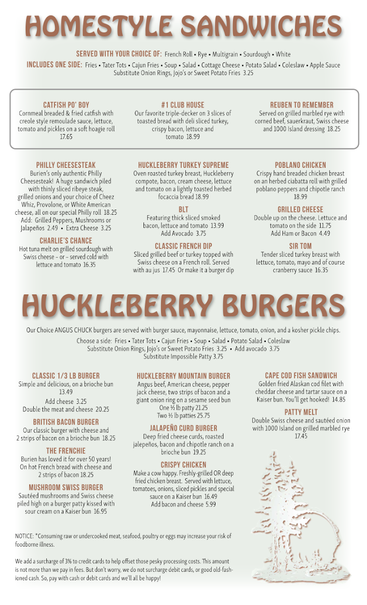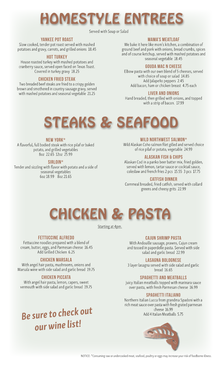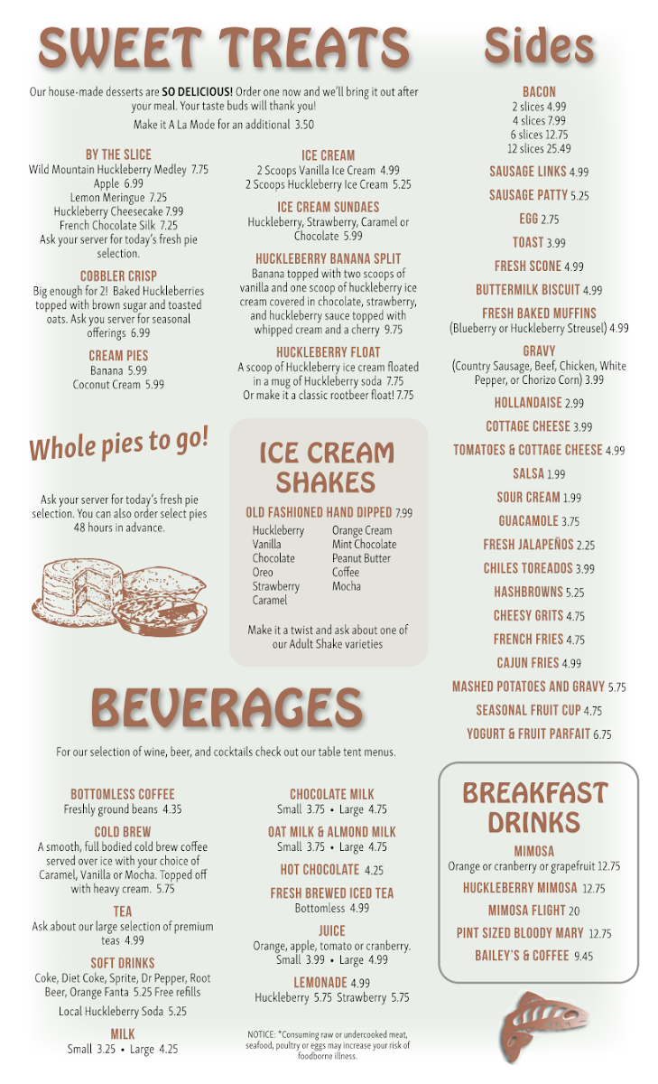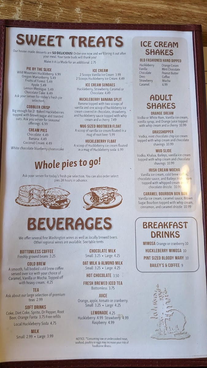 If you're in the mood for pasta, the Fettuccine Alfredo and Chicken Marsala showcase a blend of rich flavors and generous portions. Sweet tooth? Don't miss the Huckleberry Cheesecake or the exquisite Wild Mountain Huckleberry Medley pie — they're the perfect finale to your meal.